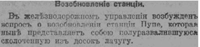 “Dzelzceļa pārvaldē ierosināts jautājums par Pūpes stacijas atjaunošanu, kas pašreiz ir pussabrukusi, no dēļiem sanaglota būda”.